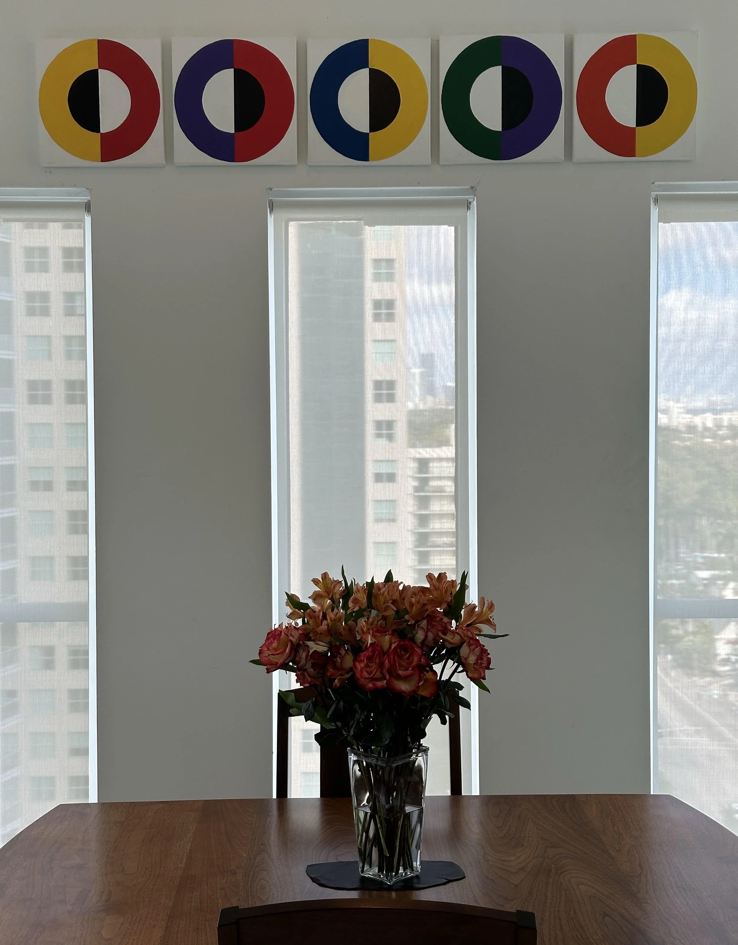 Homage to Robert Delauney, acrylic on five 12 x 12” panels, 2025